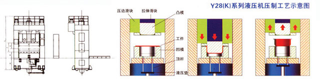 6、Tensile, compression side slide block by positioning pin etc, realize the dynamic process of single action; Machine, electricity, liquid integration of safety devices, such as cylinder inferior vena supporting circuit, oil cylinder on the superior inferior vena safety interlock circuit, etc;